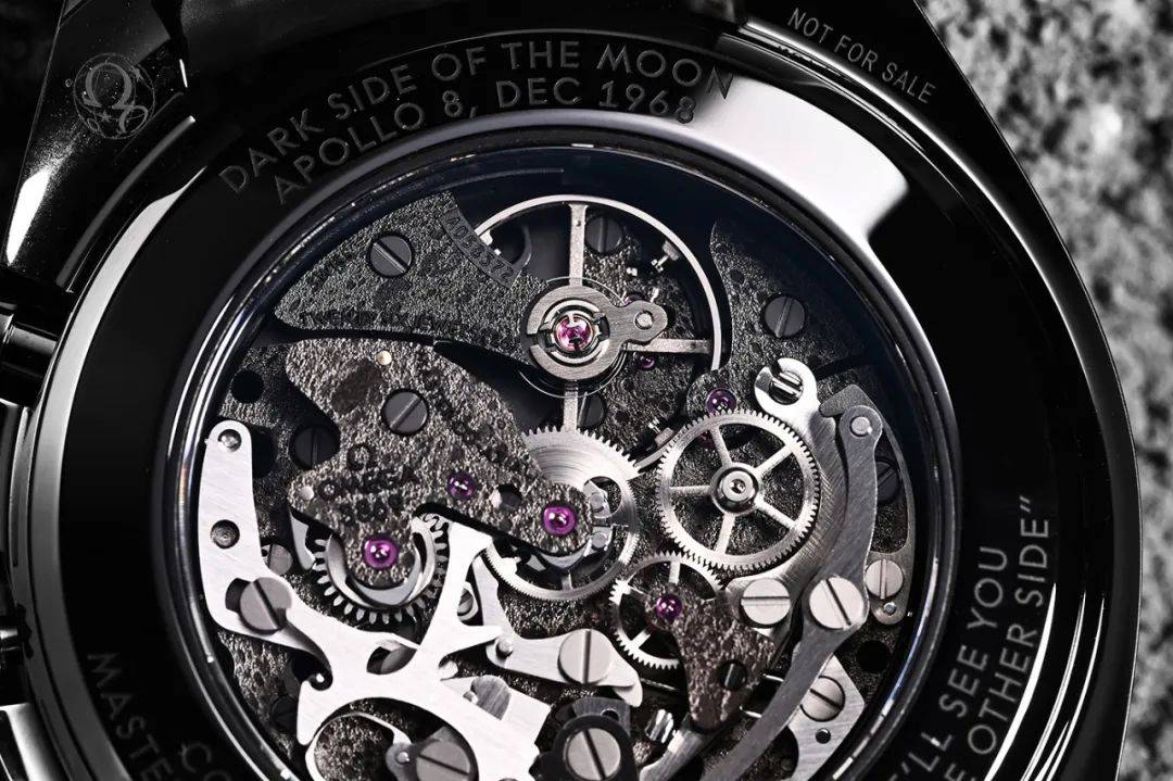 腕表搭载3869至臻天文台机芯,开创了独特的设计美学。机芯夹板经黑化处理,采用激光烧蚀技术浮雕有月球表面的纹理。同时,机芯的正面和背面呈现出月球两面的效果,独具匠心。正面展示出人们从地球可以观测到的月之正面 (近地面),背面则展示了仅有宇航员看到过的 “月之暗面” (远地面)。精湛的激光雕刻工艺和对比鲜明的效果,令新款腕表的月球纹理更加清晰。镀金摆轮呈现出深灰色,与浅灰色的齿轮相得益彰。