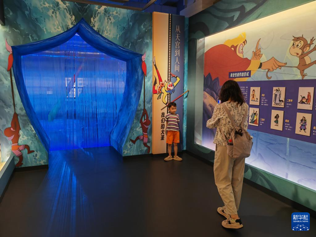 “原来孙悟空有这么多形象,除了电视剧《西游记》,动画片里还可以看到造型不同的齐天大圣,既有戏曲脸谱的夸张,又不失漫画的灵动,太好看了。”学生黄豆豆一边说着,一边与巨型金箍棒合影。在展览的“大圣空间”内,展出了8部有孙悟空角色的动画藏品,观众可以了解动画的制作场景和创作者的心路历程。